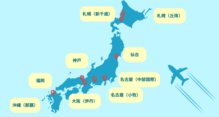 札幌(新千歳)、札幌(丘珠)、仙台、名古屋(中部国際)、名古屋(小牧)、大阪(伊丹)、神戸、福岡、沖縄(那覇)